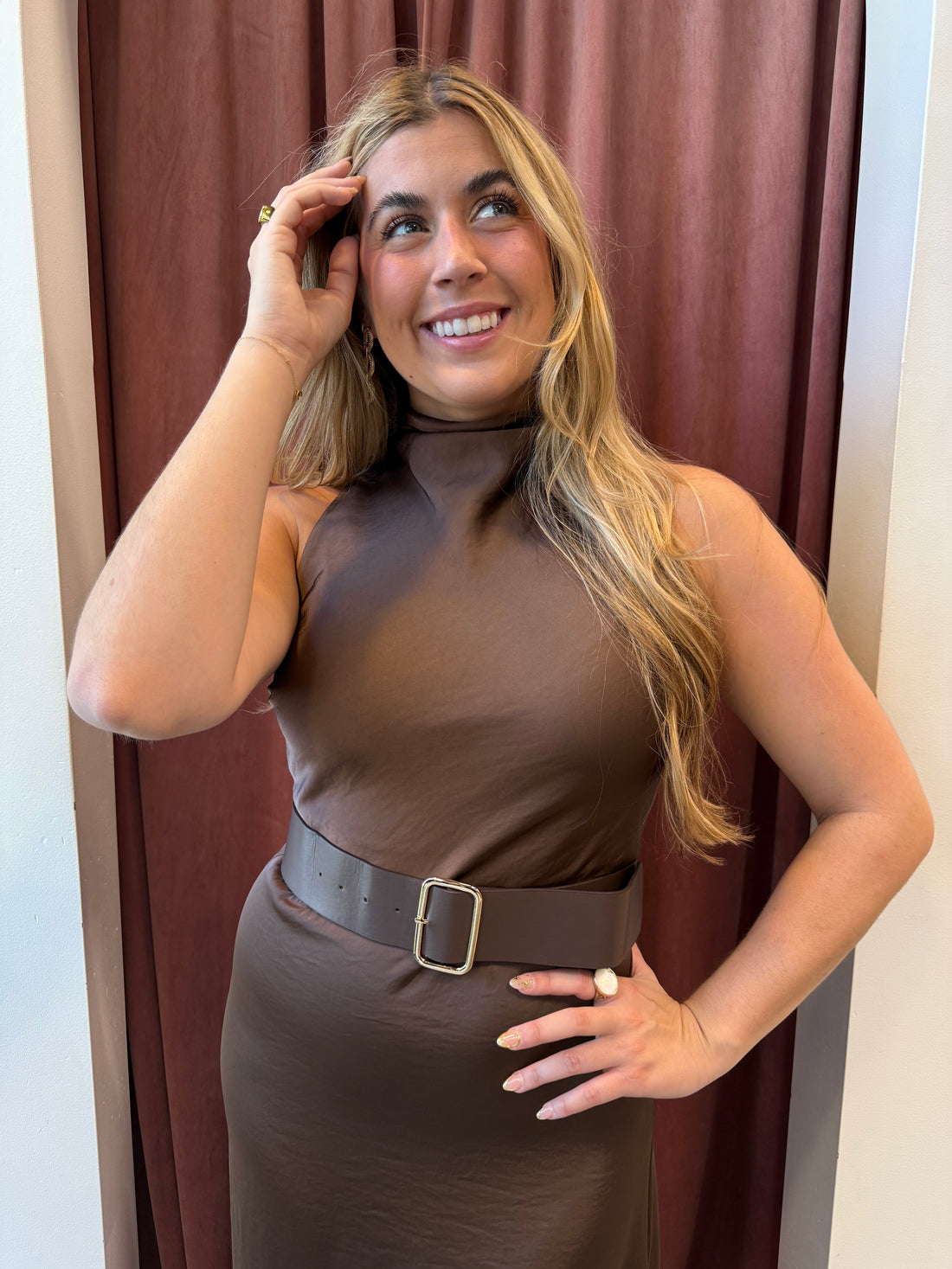 All The Gossip Mock Neck Satin Midi Dress